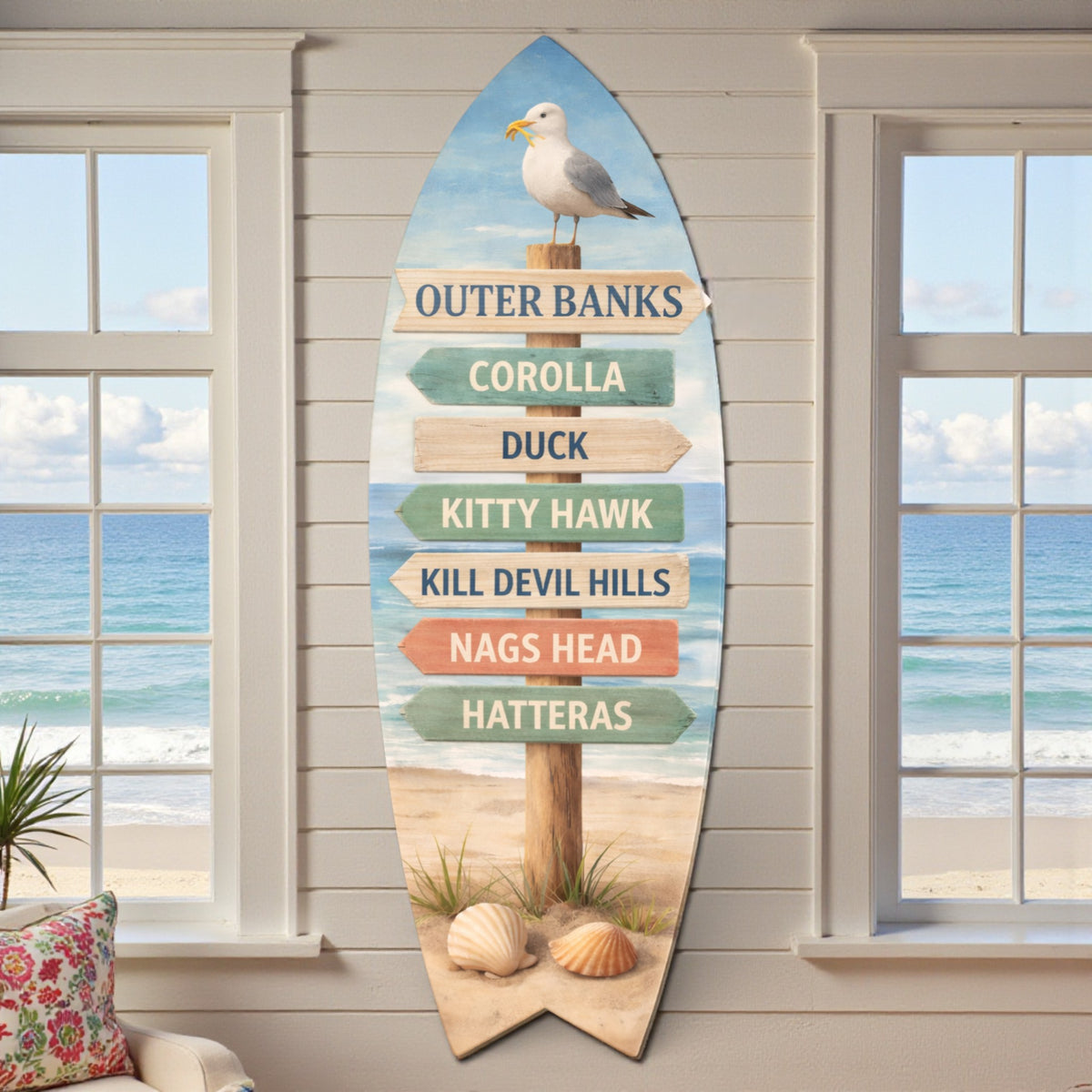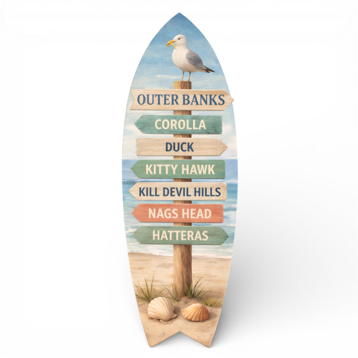 The Outer Banks Surfboard brings coastal charm to any space with its distinctive design inspired by North Carolina's legendary surf destinations. This versatile PVC surfboard works equally well as a decorative accent indoors or as a weather-resistant display piece for patios and outdoor areas. Whether you're a seasoned surfer reminiscing about sessions at Corolla, Duck, Kitty Hawk, Kill Devil Hills, Nags Head, or Hatteras, or simply drawn to authentic beach culture, this board captures the spirit of the Outer Banks. Its durable construction withstands the elements while maintaining its vibrant appearance, making it an ideal choice for beach houses, surf shops, or anyone seeking to celebrate the region's rich surfing heritage.