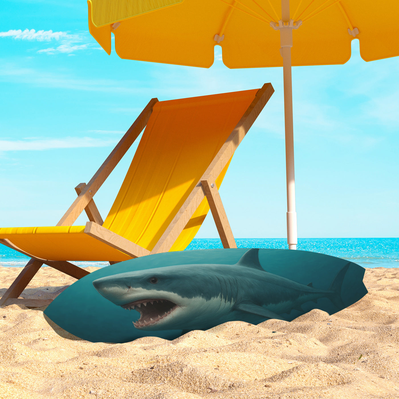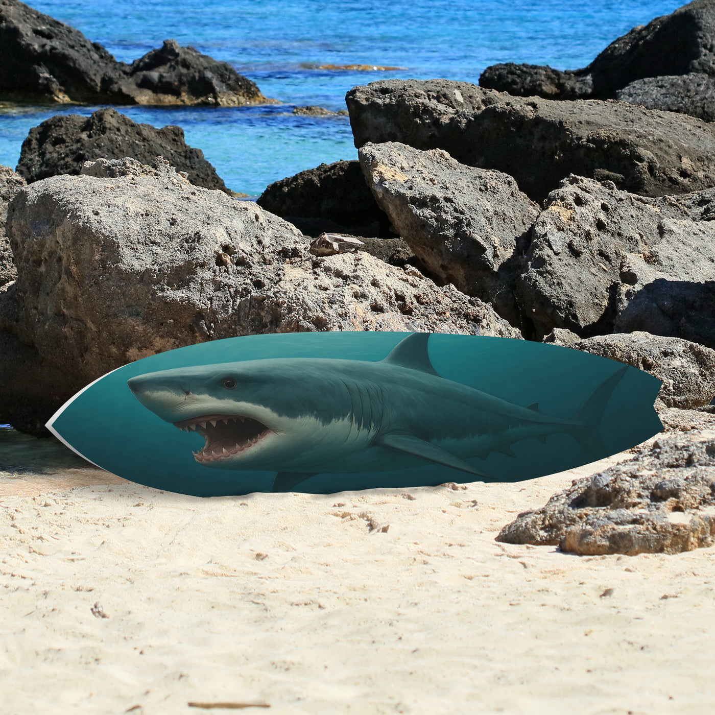 Shark Surfboard Wall Decor: This horizontal surfboard wall art features a lifelike great white shark swimming in the ocean depths - a bold and captivating design that's perfect for ocean and shark lovers.