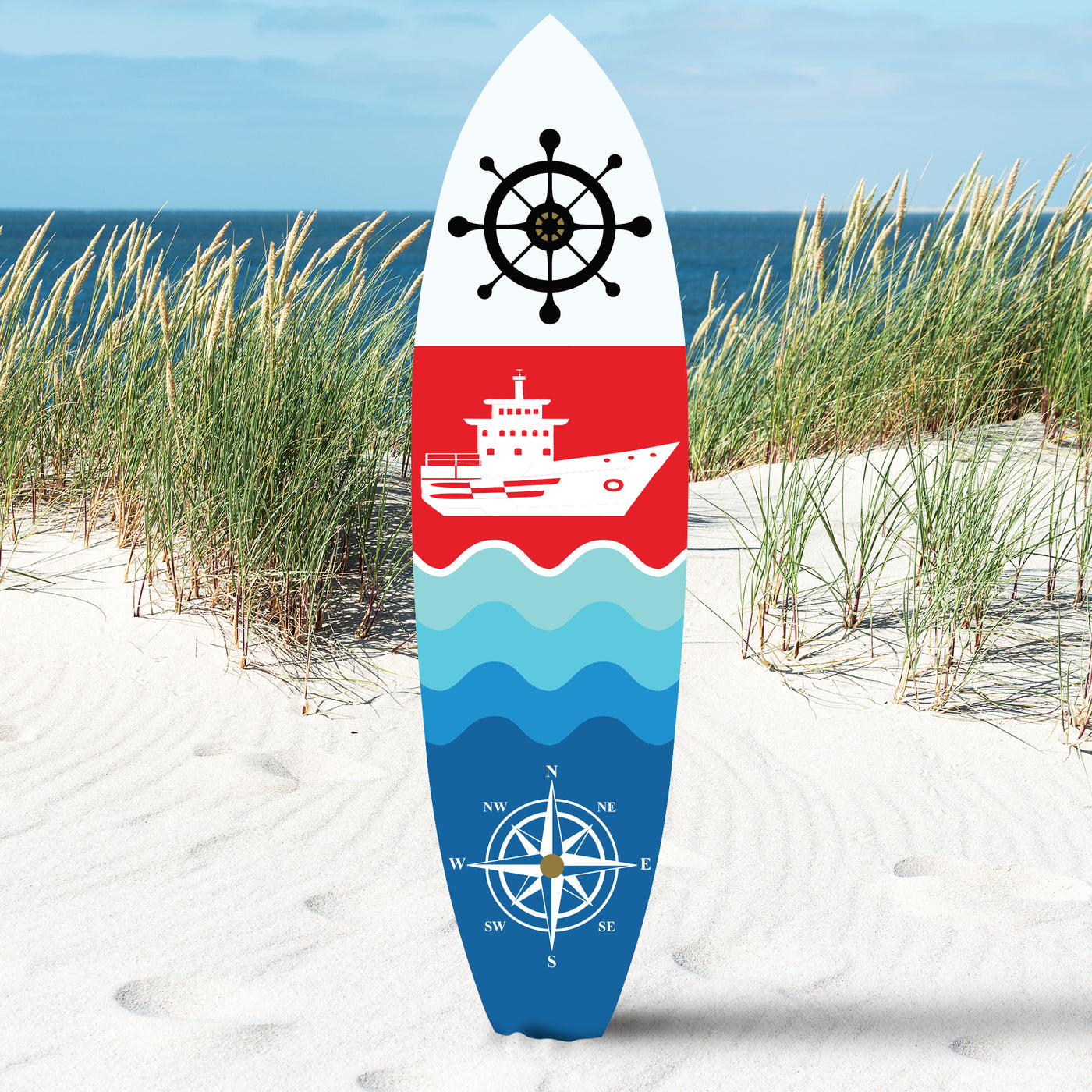 Original Nautical Design: Features a ship, compass, captain's wheel, and waves in patriotic red, white, and blue colors-perfect for boaters, ocean lovers, and anyone who loves the relaxation of being on the water.
