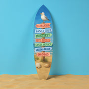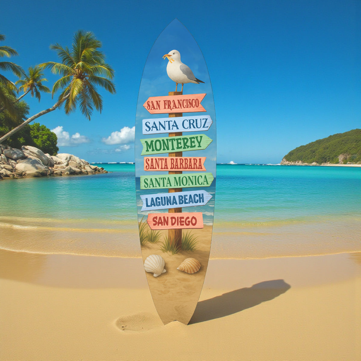 California Coastal Design: Features a directional post listing popular beach towns like San Francisco, Monterey, Santa Barbara, Laguna, and San...