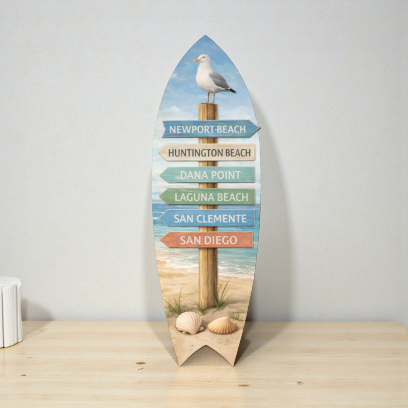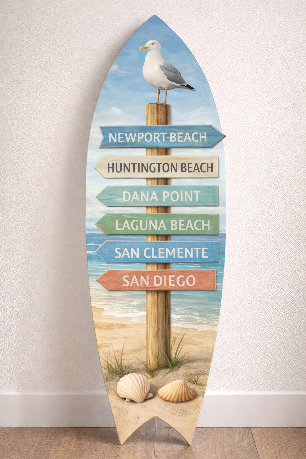 Designed with soft beach tones, ocean scenery, and a charming directional signpost, this surfboard is topped with a perched seagull and finished with seashell details at the base for an authentic coastal look.